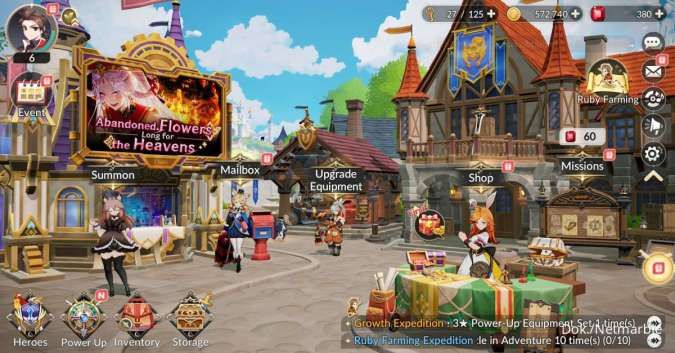 Sistem Ekonomi & MonetisasiAda mata uang “Rubies” untuk summon hero, sistem reroll (mengulang akun awal agar dapat hero bagus) direkomendasikan.